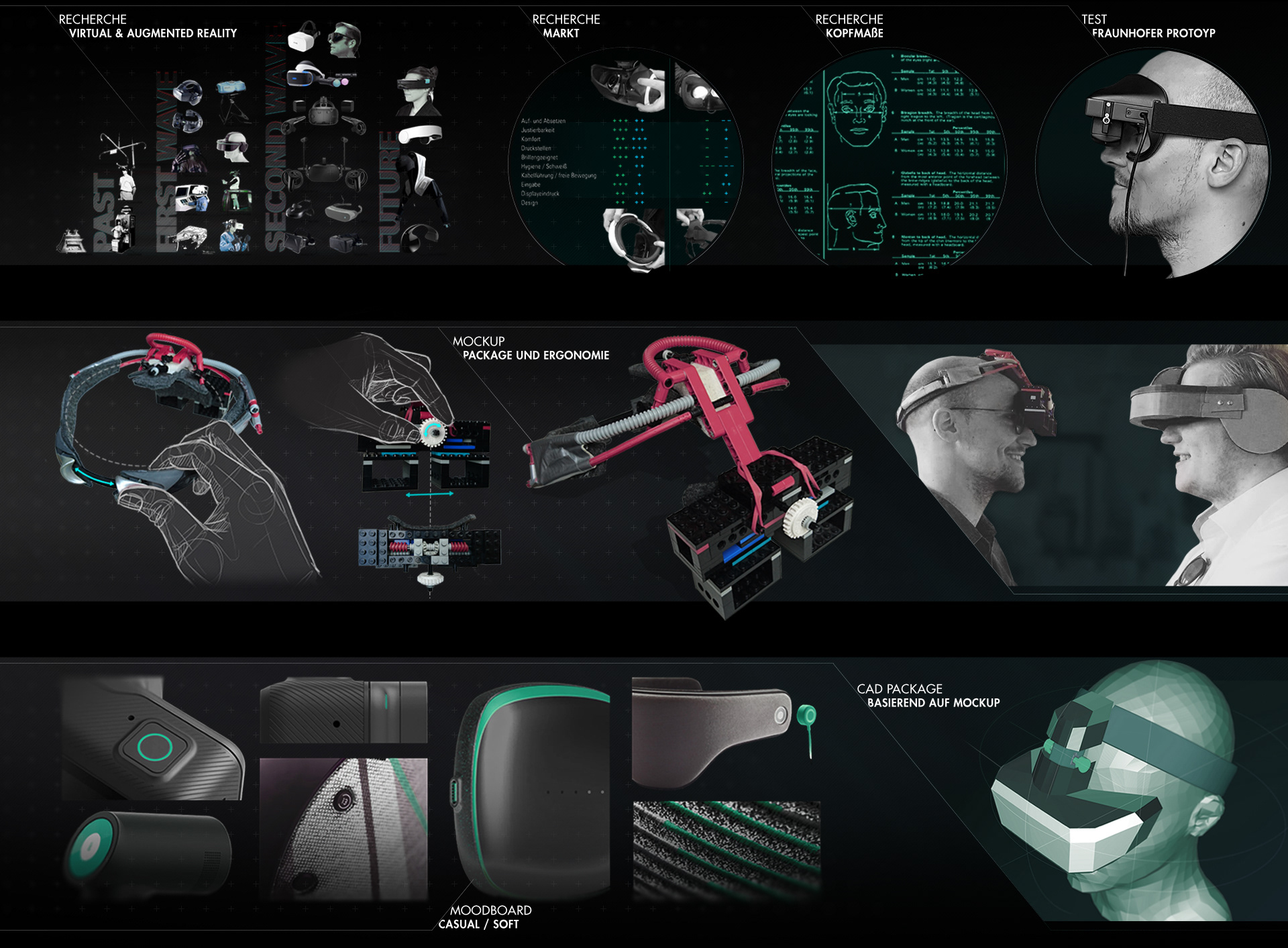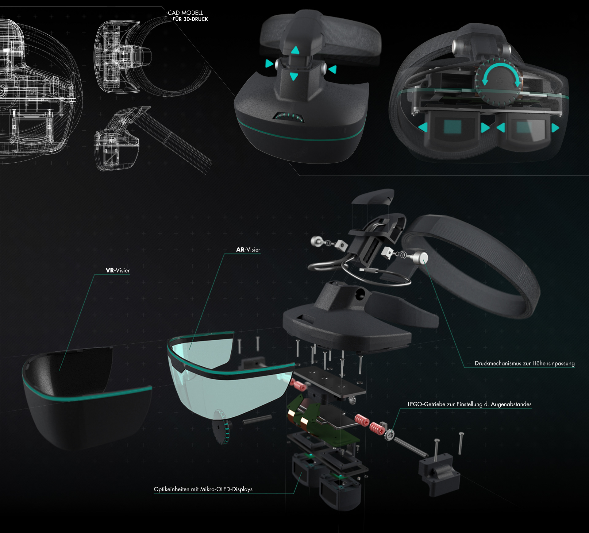 Die Vorzugsvariante aus der Testphase, ein an einem Stirnband frei vor dem Gesicht schwebendes Brillenpackage, wurde als Entwurf ausgearbeitet. Durch austauschbare Visierteile sollen auf einfache Weise VR- sowie AR-Anwendungen darstellbar gemacht werden.