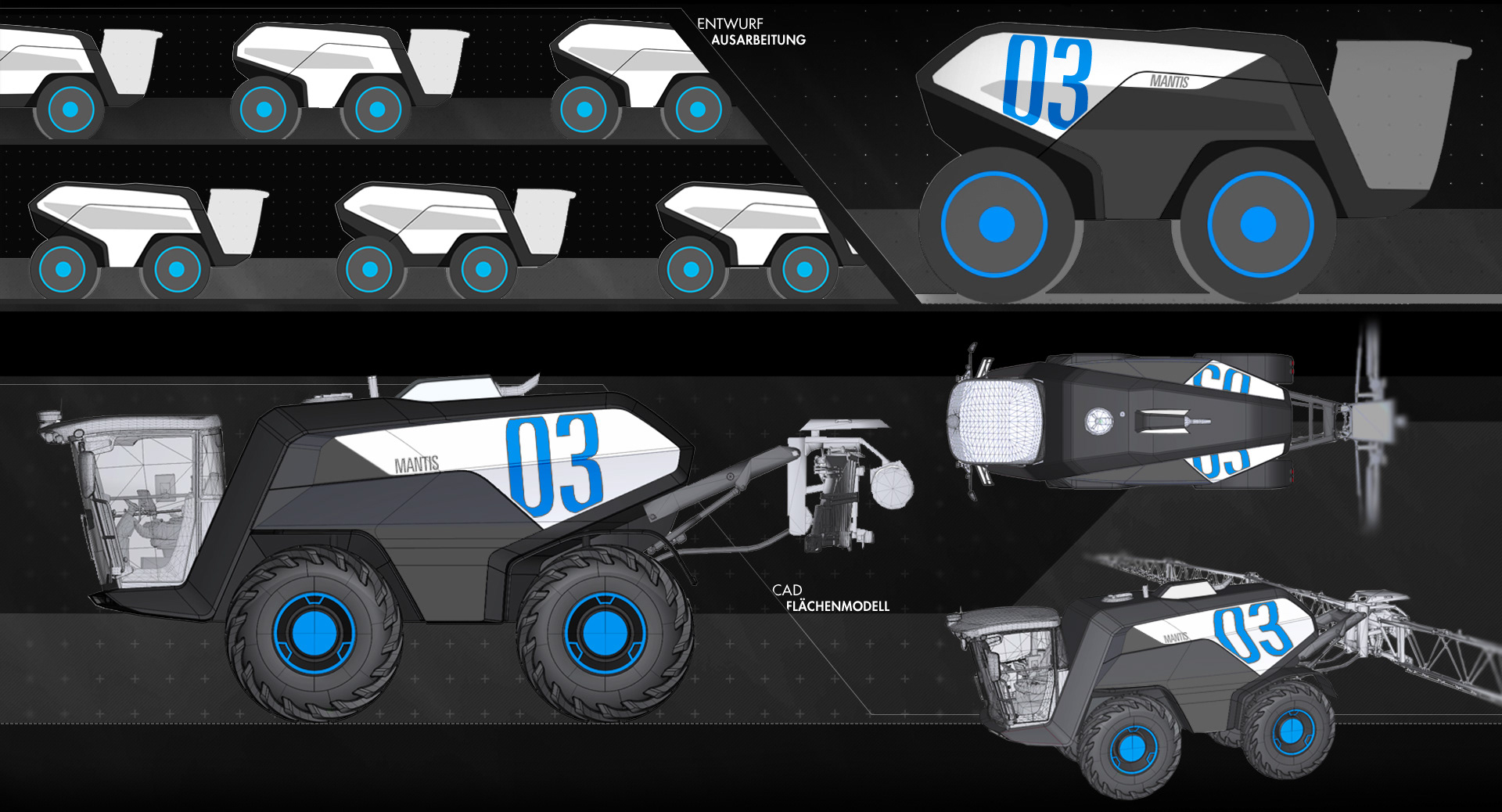 Die ausgewählte Entwurfsskizze wurde zunächst in Vektorgrafiken hinsichtlich Proportionen und Grafik weiter verfeinert, bevor die Umsetzung im CAD erfolgte. Auch hier diente das 3D-Package einer handelsüblichen Feldspritze als Anhaltspunkt für die Gestaltung.