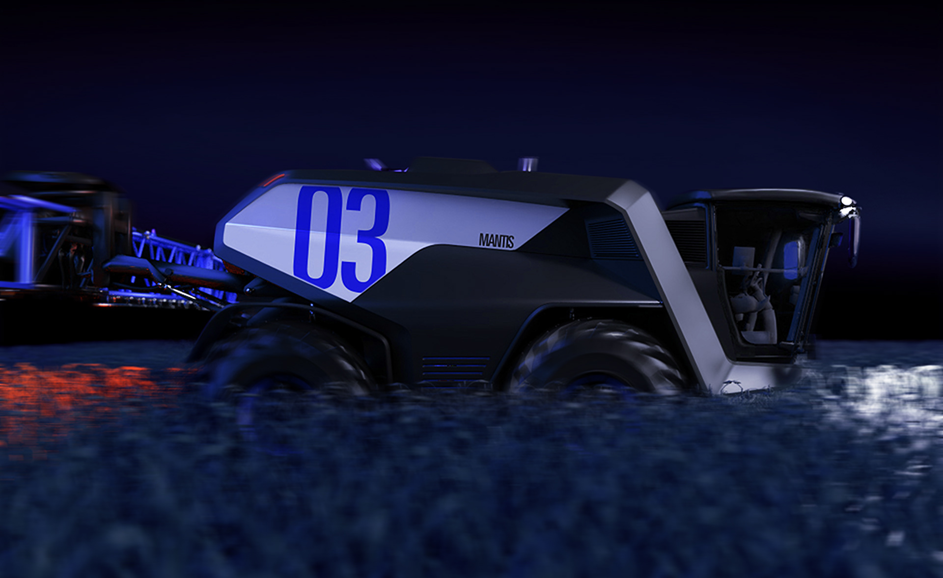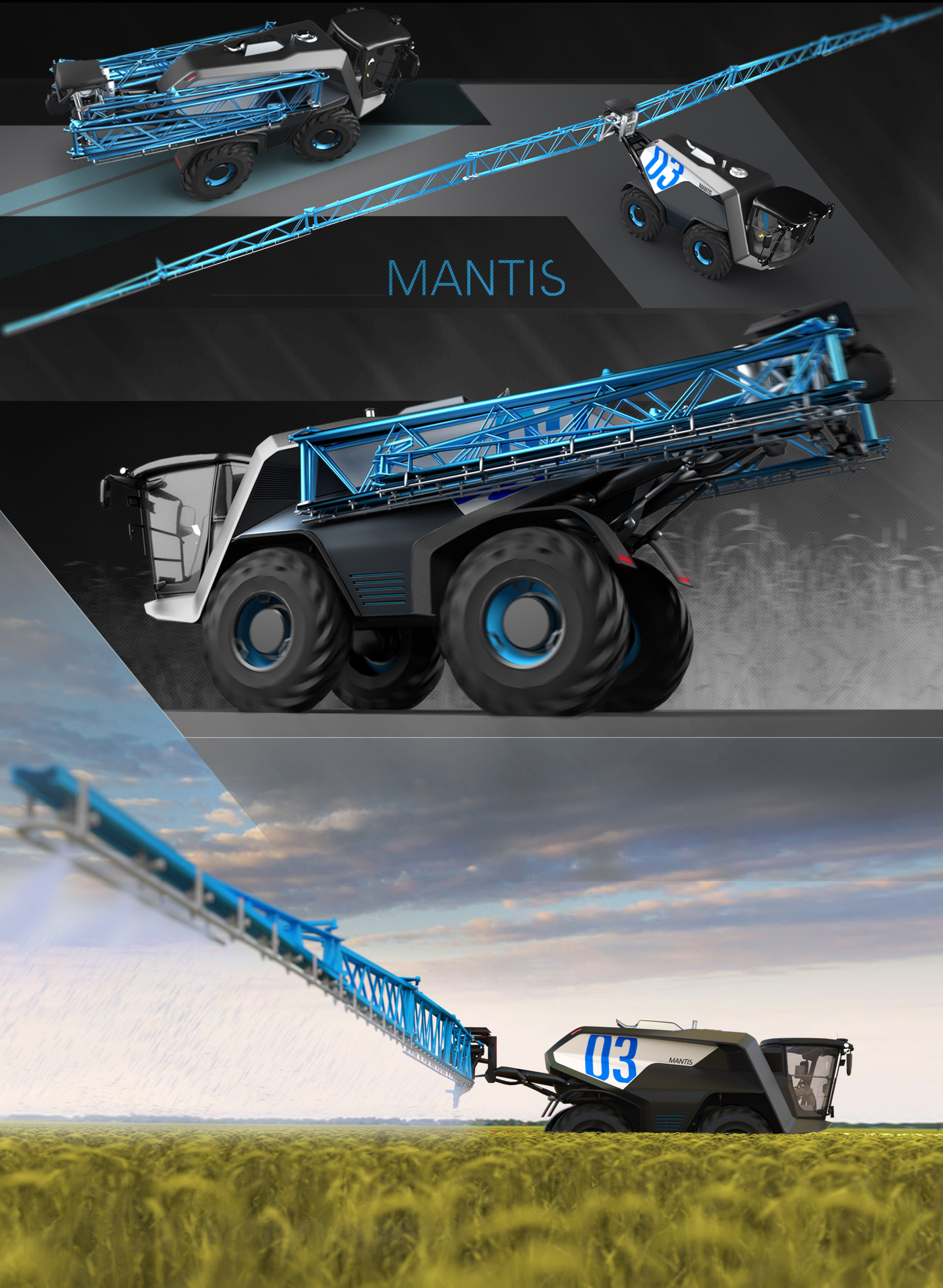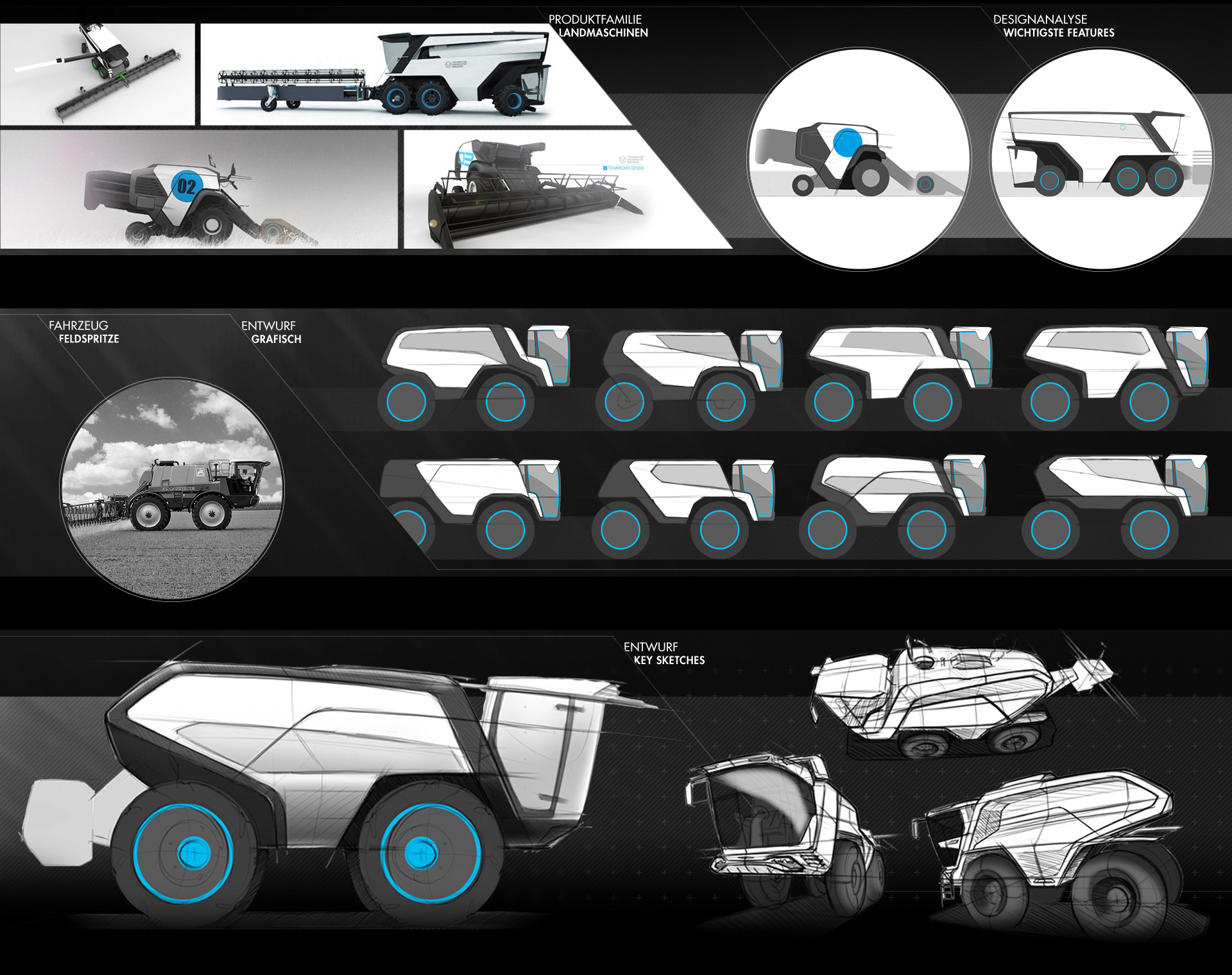 Der Entwurf der Feldspritze bezieht sich auf zwei Mähdrescher einer Produktfamilie. Als Ausgangspunkt für die Gestaltung wurden zwei auf die wesentlichen Designfeatures reduzierte Vektorgrafiken der Fahrzeuge angefertigt. Das Package einer handelsüblichen Feldspritze diente als Grundlage für die Skizzen.